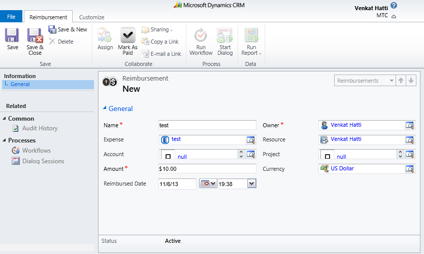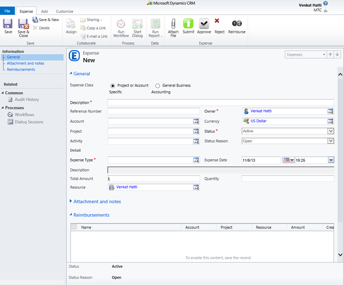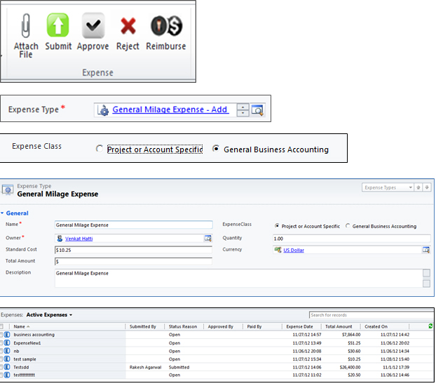 CRM ribbon made easy to handle expense - Attach File, Submit, Approve, Reject, and Reimburse.Expense Class - Categorized for Project Specific Expense or General Business Accounting