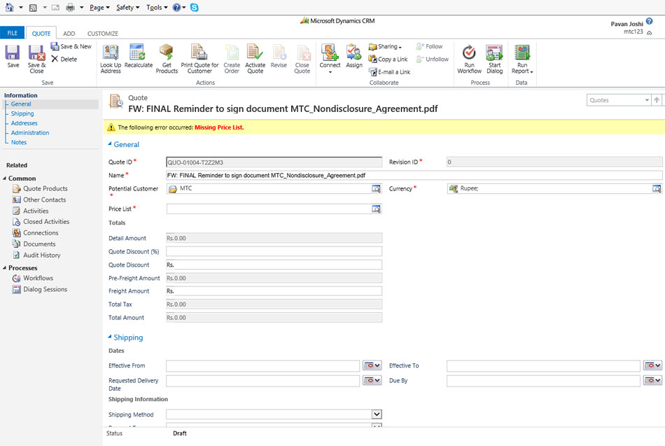 E-Mail to Quote is an Add in for Microsoft Outlook 2003 or higher version which integrates Outlook with another popular Enterprise application named Microsoft Dynamics CRM. E-Mail to Quote fits in perfectly for processing quotes based on Accounts or Contacts and need to be converted to MSCRM Quotes.